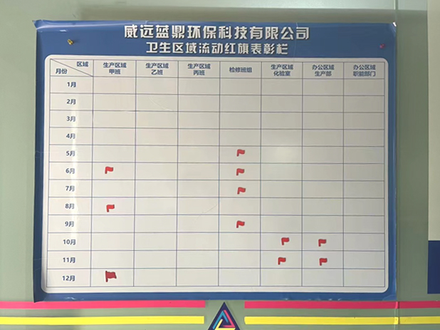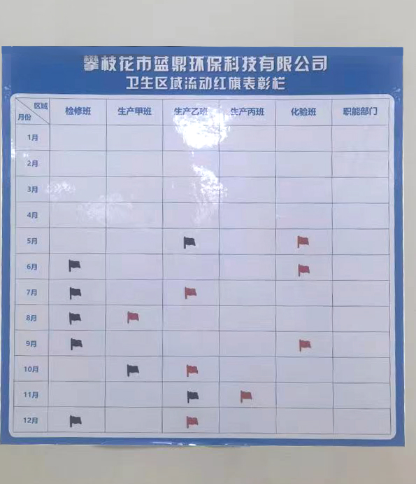 為促進工作環(huán)境衛(wèi)生持續(xù)向好發(fā)展,2023年5月,集團為各公司做了衛(wèi)生分區(qū)與責(zé)任劃分,同時設(shè)立衛(wèi)生流動紅旗制度,以評估每個班組的衛(wèi)生清潔情況。紅旗代表該班組的本月衛(wèi)生情況最好,黑旗則代表衛(wèi)生情況不佳,需要整改。到12月底,攀藍鼎、西昌藍鼎、威遠藍鼎2023年度各個班組的衛(wèi)生流動紅旗評選結(jié)果已出爐。